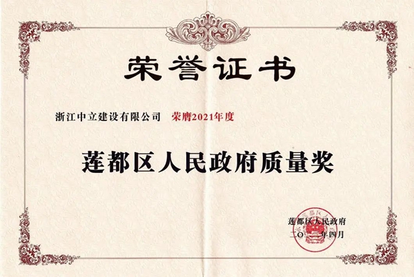 喜報丨中立建設榮獲“2021 年蓮都區(qū)人民政府質(zhì)量獎”
