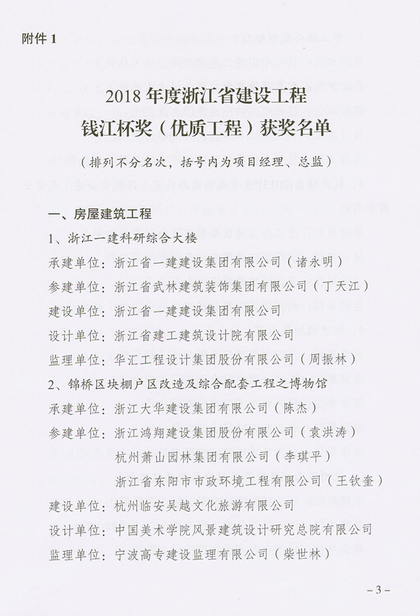 喜報(bào)!近日,省建設(shè)廳頒發(fā)了2018年度浙江省建設(shè)工程“錢江杯”(優(yōu)質(zhì)工程)文件,我公司“麗水市體育館體育中心工程、松陽縣供電局電力調(diào)度生產(chǎn)綜合用房工程”分別獲得2018年度“錢江杯”(優(yōu)質(zhì)工程)獎(jiǎng)。